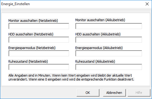 Besonders bei Notebooks und Tablets soll Energie gespart werden. Um die Einstellungen einheitlich vornehmen zu können, verwenden Sie das Konfigurationspaket "Energie_Einstellen". Die Zeiten für die einzelnen Aktionen geben Sie im Menü ein:
