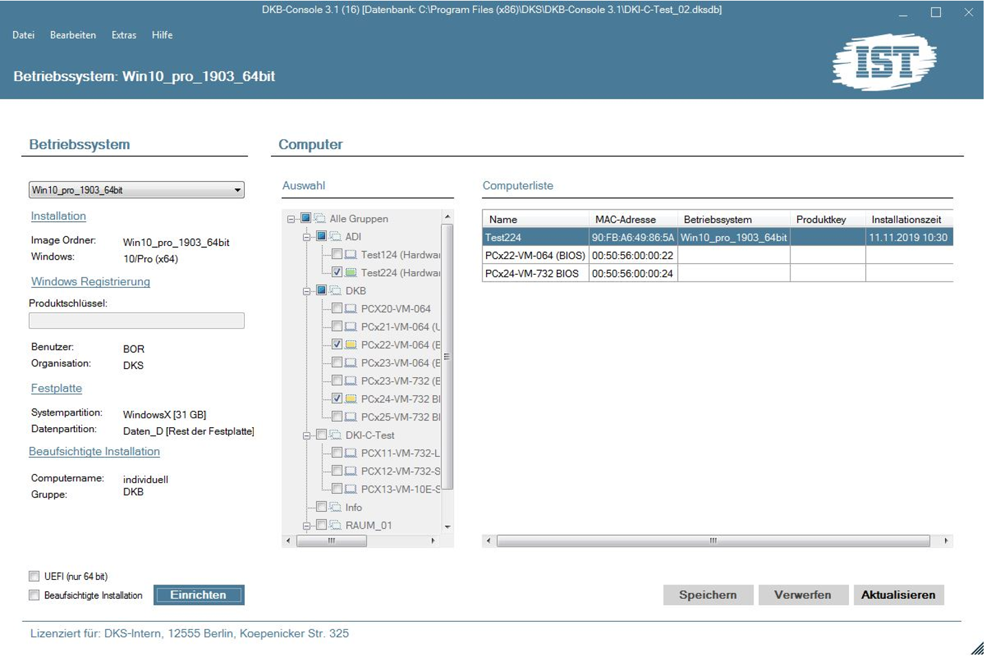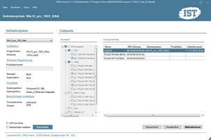In der DKB-Console wählen Sie die Computer und das Betriebssystem aus. Sie können Windows 7, 8.1 und Windows 10 in verschiedenen Editionen (z.B. Education, Enterprise, Ultimate) in 32 Bit- oder 64Bit-Ausführung installieren.